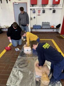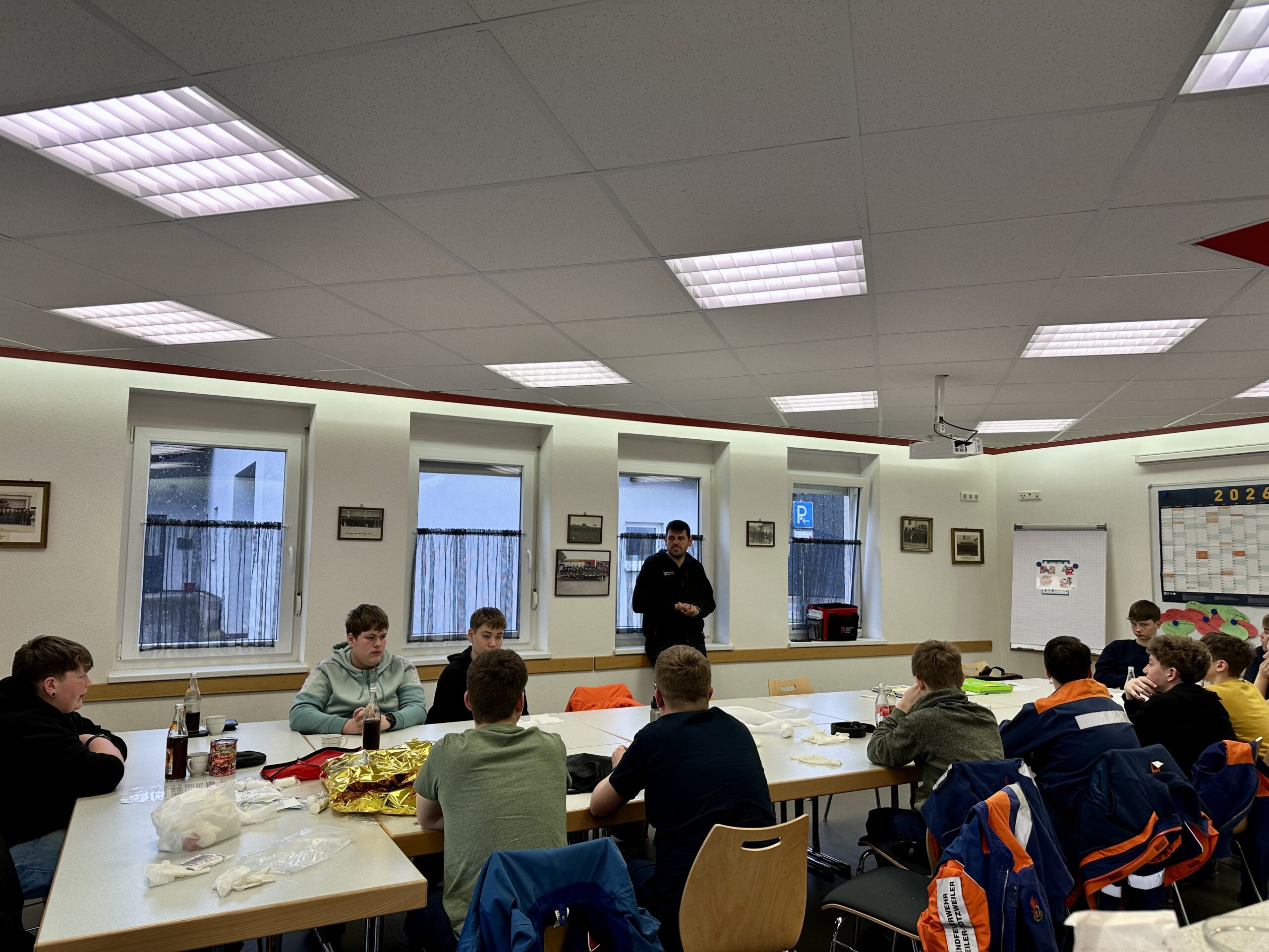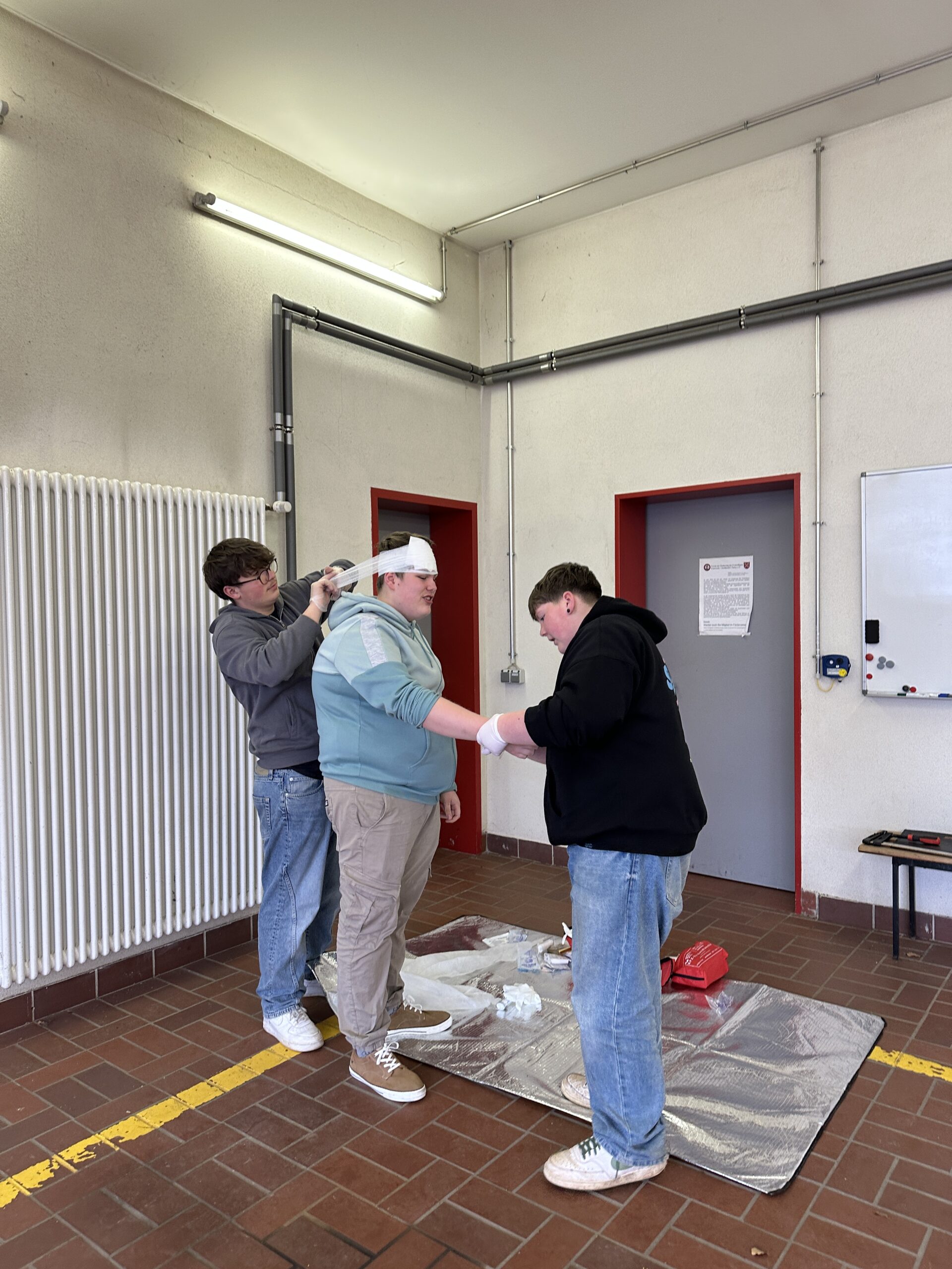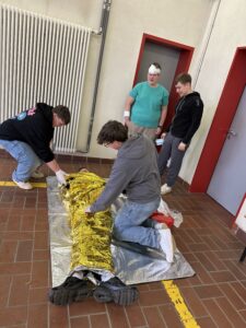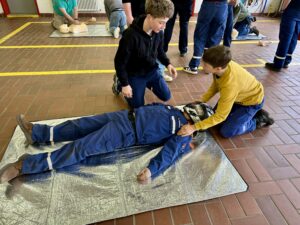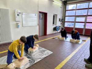 Zu den behandelten Inhalten gehörten unter anderem das richtige Verhalten am Unfallort, das Absetzen eines Notrufs, die Wundversorgung, die stabile Seitenlage sowie Maßnahmen zur Wiederbelebung. Besonders großer Wert wurde auf das eigenständige Üben gelegt, sodass jeder Teilnehmer und jede Teilnehmerin die einzelnen Handgriffe mehrfach anwenden konnte. Die Jugendlichen zeigten großes Interesse und arbeiteten engagiert mit. Durch die praxisnahen Übungen konnten sie ihre Kenntnisse festigen und Sicherheit im Umgang mit Notfallsituationen gewinnen.