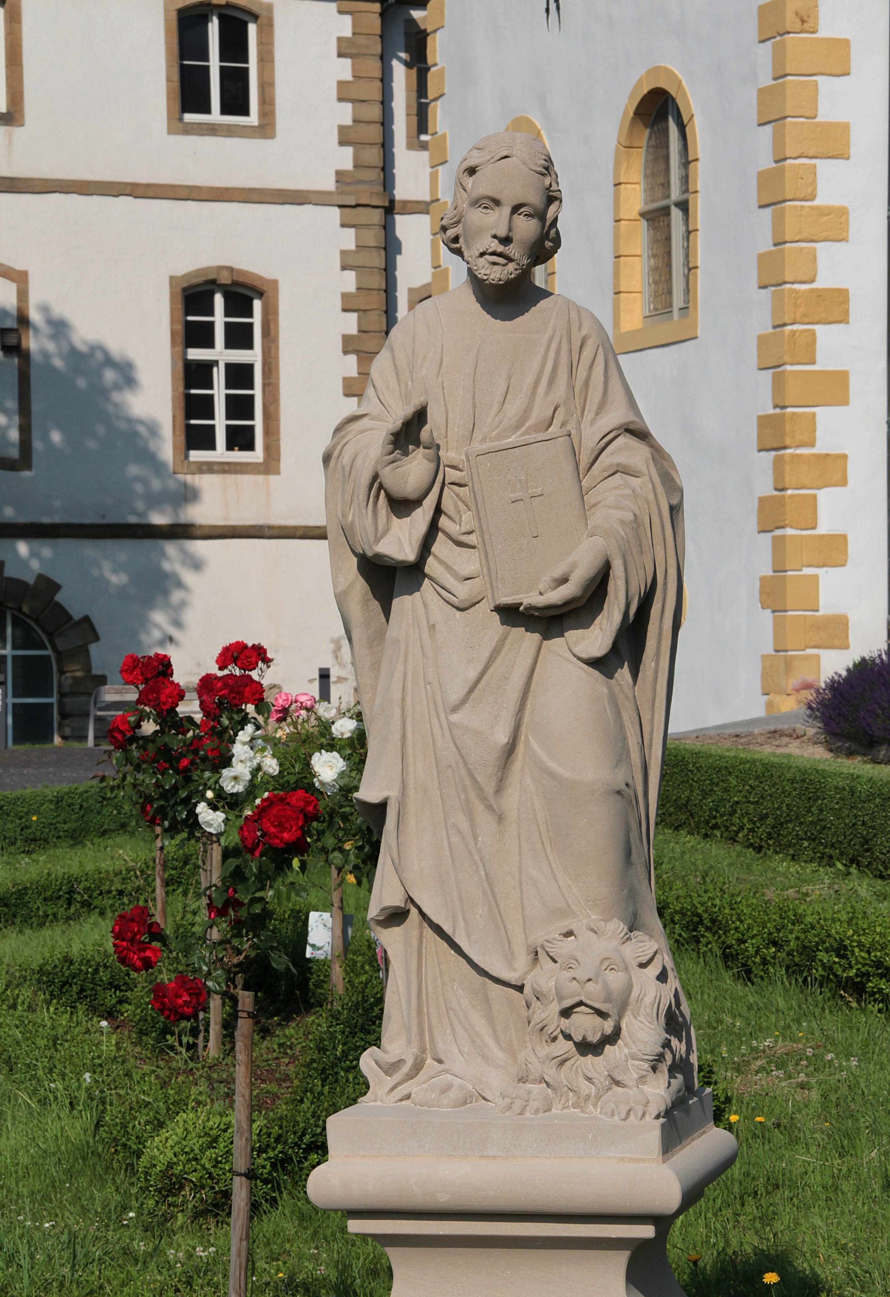 Kolossalplastik im Tholeyer Abteigarten: Monumentalkopf des Heiligen Mauritius angekommen