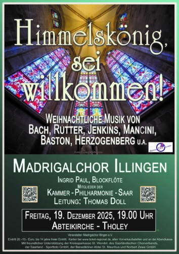 Am Freitag, dem 19.12.2025 veranstaltet um 19 Uhr der Madrigalchor Illingen bereits zum vierten Mal sein traditionelles Advents- und Weihnachtskonzert in der Abteikirche Tholey.