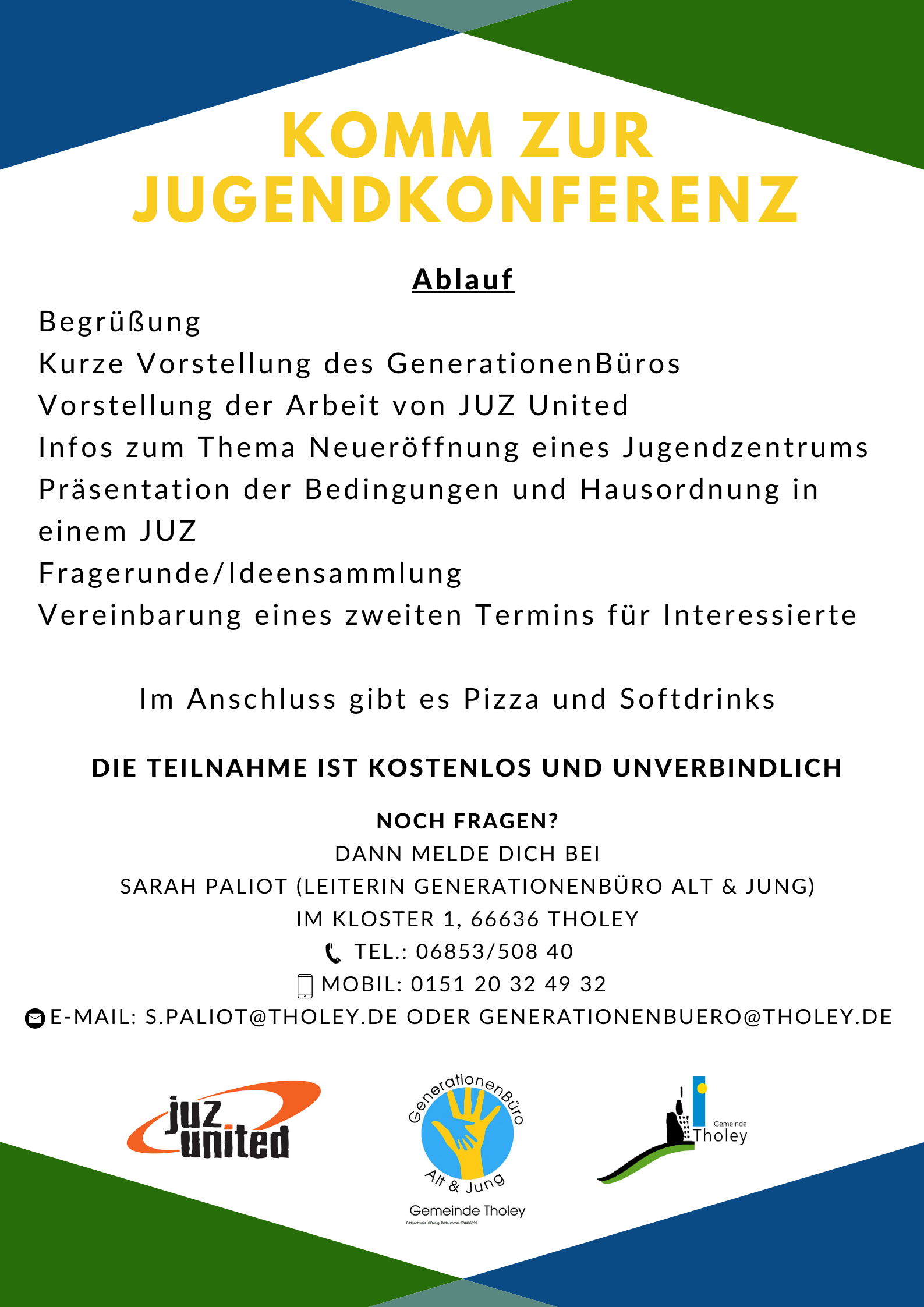 Am Mittwoch, 15.03.2023 findet um 18:00 Uhr eine Jugendkonferenz zum Thema „selbstverwaltetes JUZ“ in Tholey statt. Kommt vorbei – für Snacks und Getränke ist gesorgt!