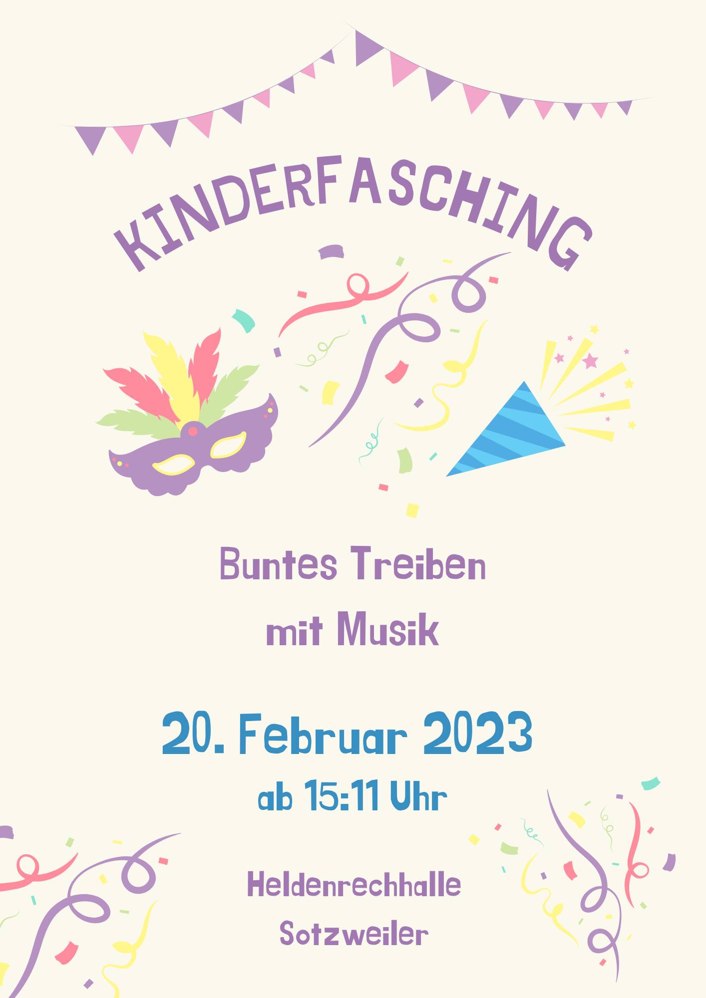 Am Rosenmontag, dem 20.02.2023 findet wie üblich die Kinderfaasend in der Heldenrechhalle statt. Start der Veranstaltung ist 15:11 Uhr.