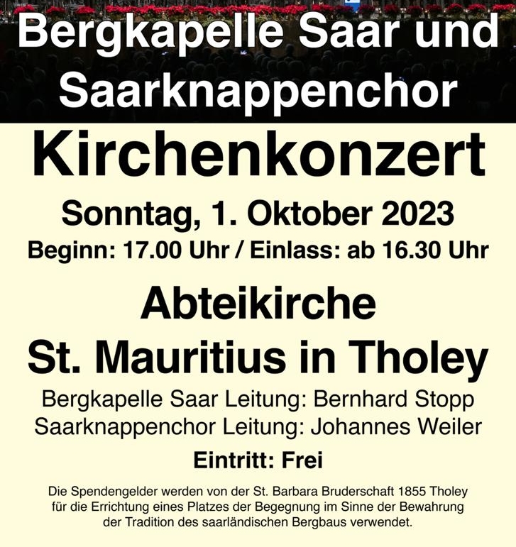 Die St Barbara Bruderschaft 1855 Tholey Veranstaltet mit dem Saarknappenchor und der Bergkapelle am 1. Oktober 2023 um 17 Uhr ein Konzert in der Abteikirche in Tholey .